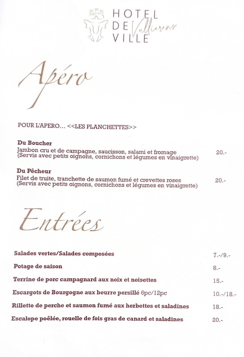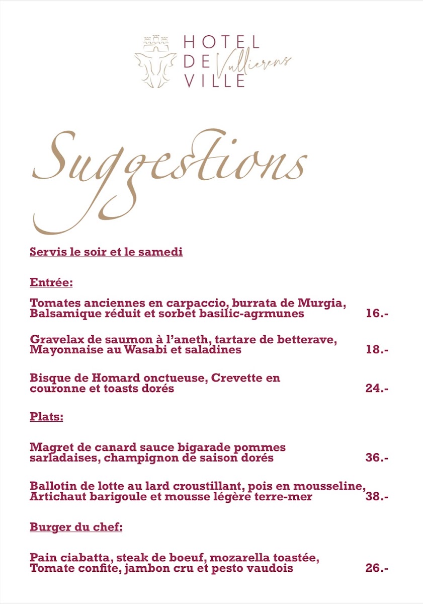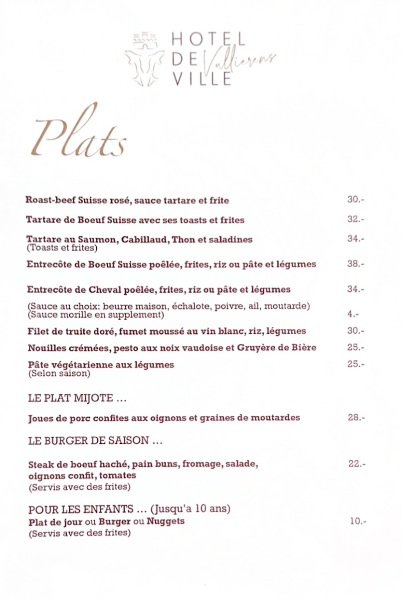 Families will appreciate the Burger Enfant, a kid-friendly option that provides a fun, tasty meal for younger guests. Whether you're indulging in a sophisticated dinner or enjoying a relaxed meal with loved ones, Restaurant Vullierens’ menu ensures a variety of options to suit every taste.